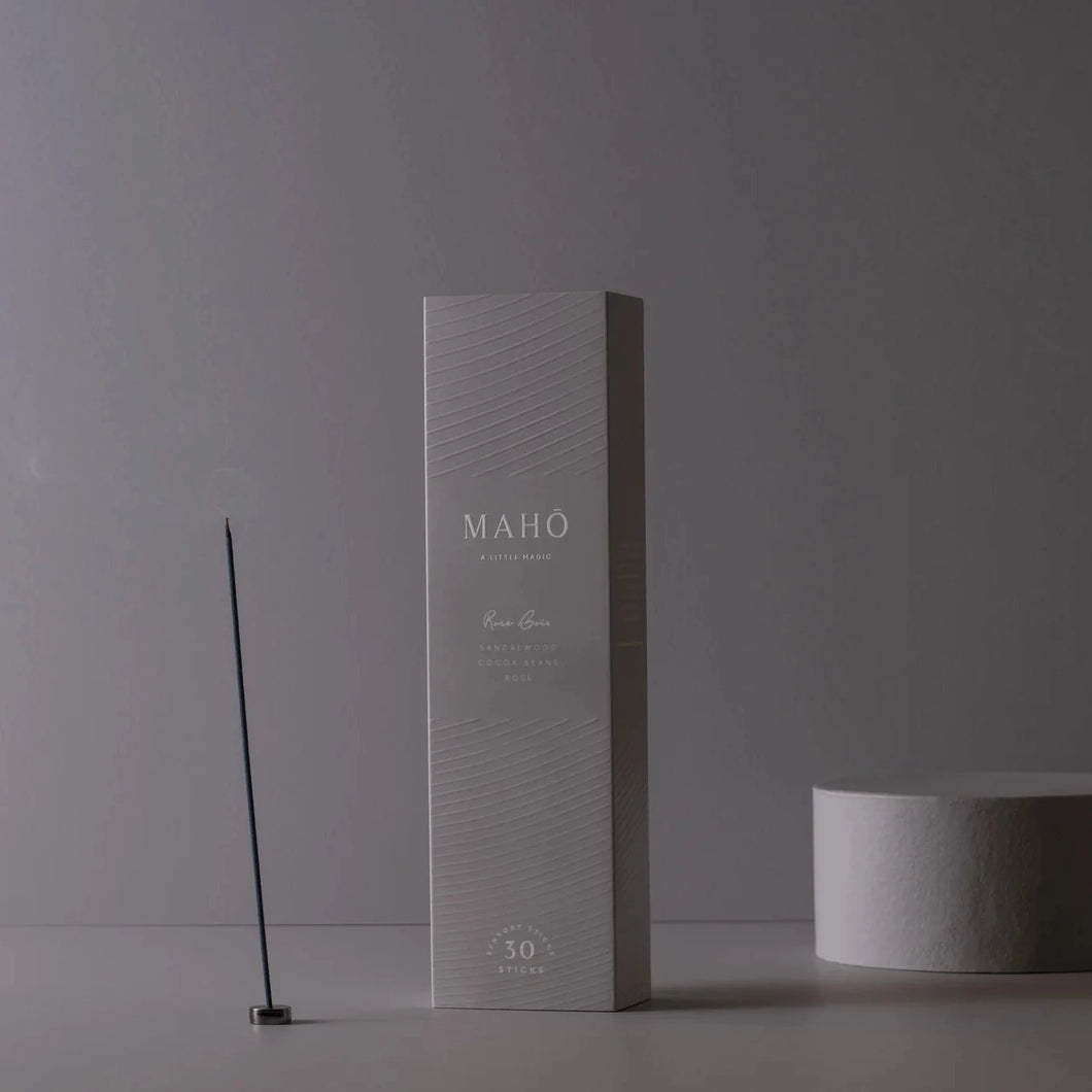 Light the tip of one incense over fire. Extinguish the flame by blowing or fanning. Incense should emit a glowing ember and fragrance with smoke. Return smouldering Sensory Stick to the MAHŌ Incense burner.