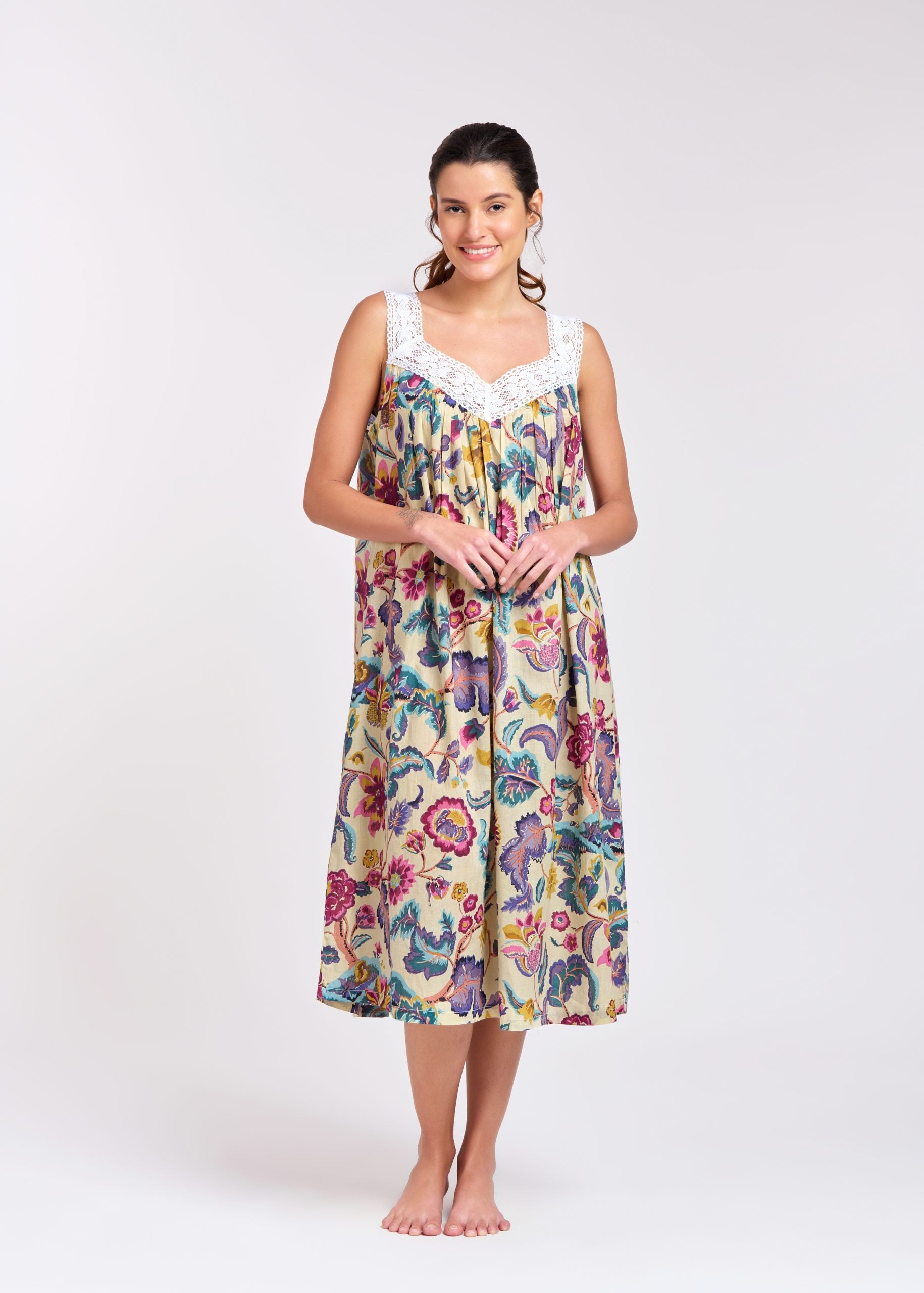 We just love these gorgeous cotton nighties. This one comes in a fabulous purple and pink floral print on a cream background with a v-neck lace trim around the neckline.