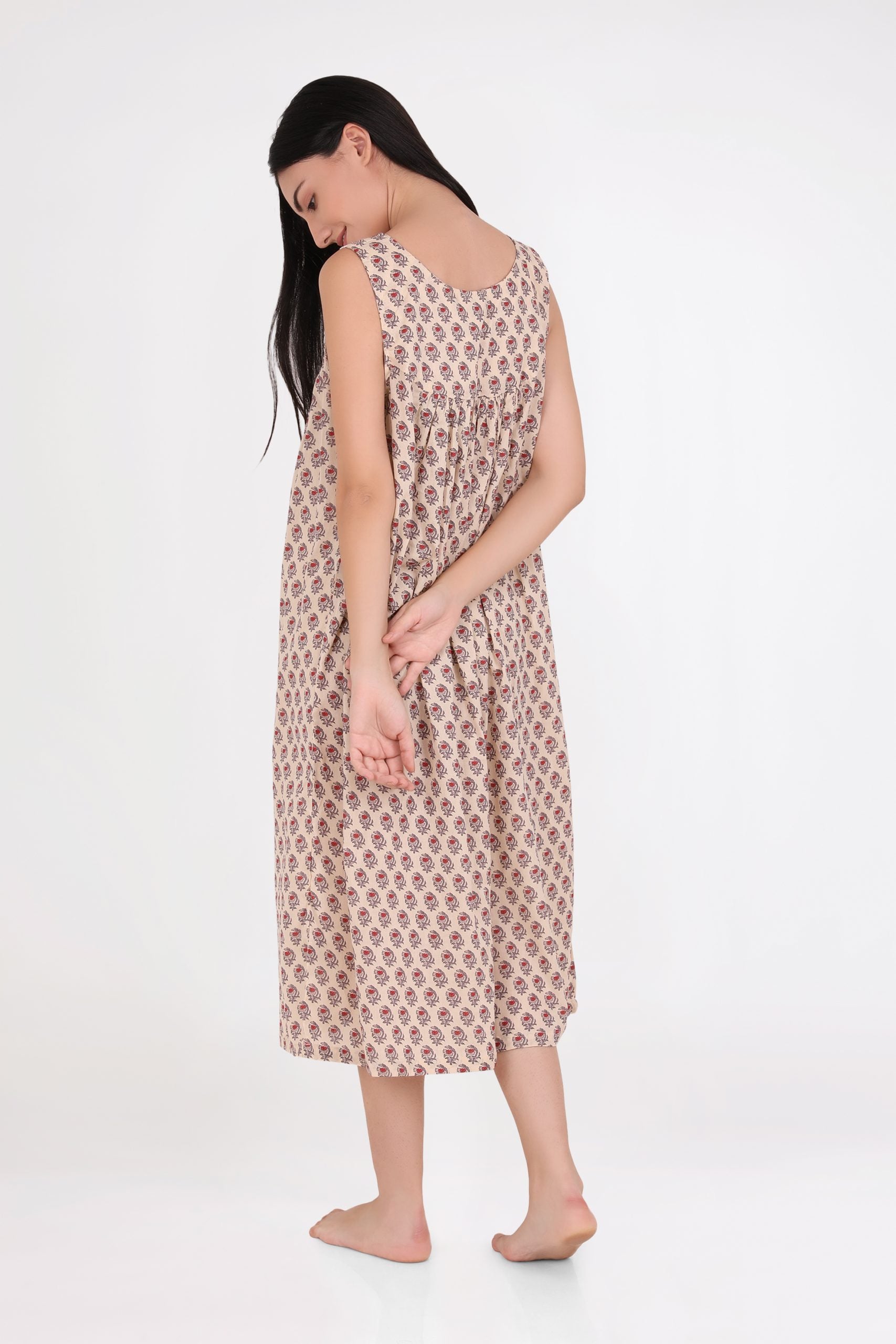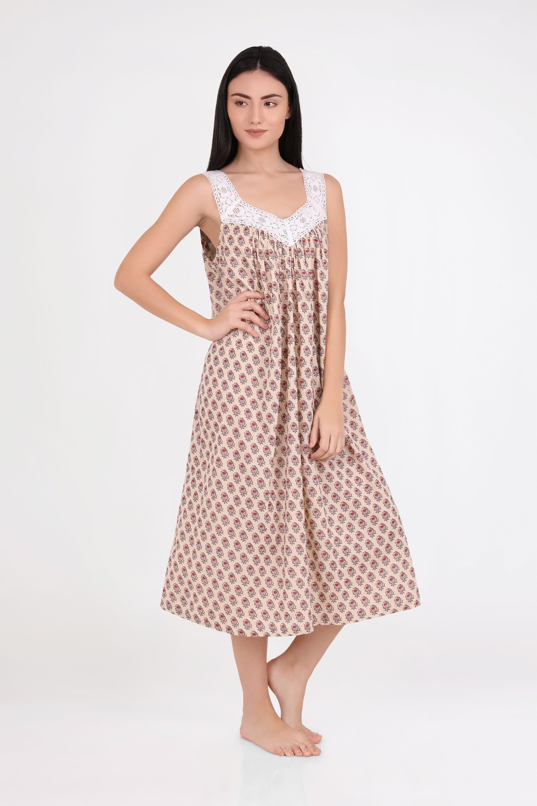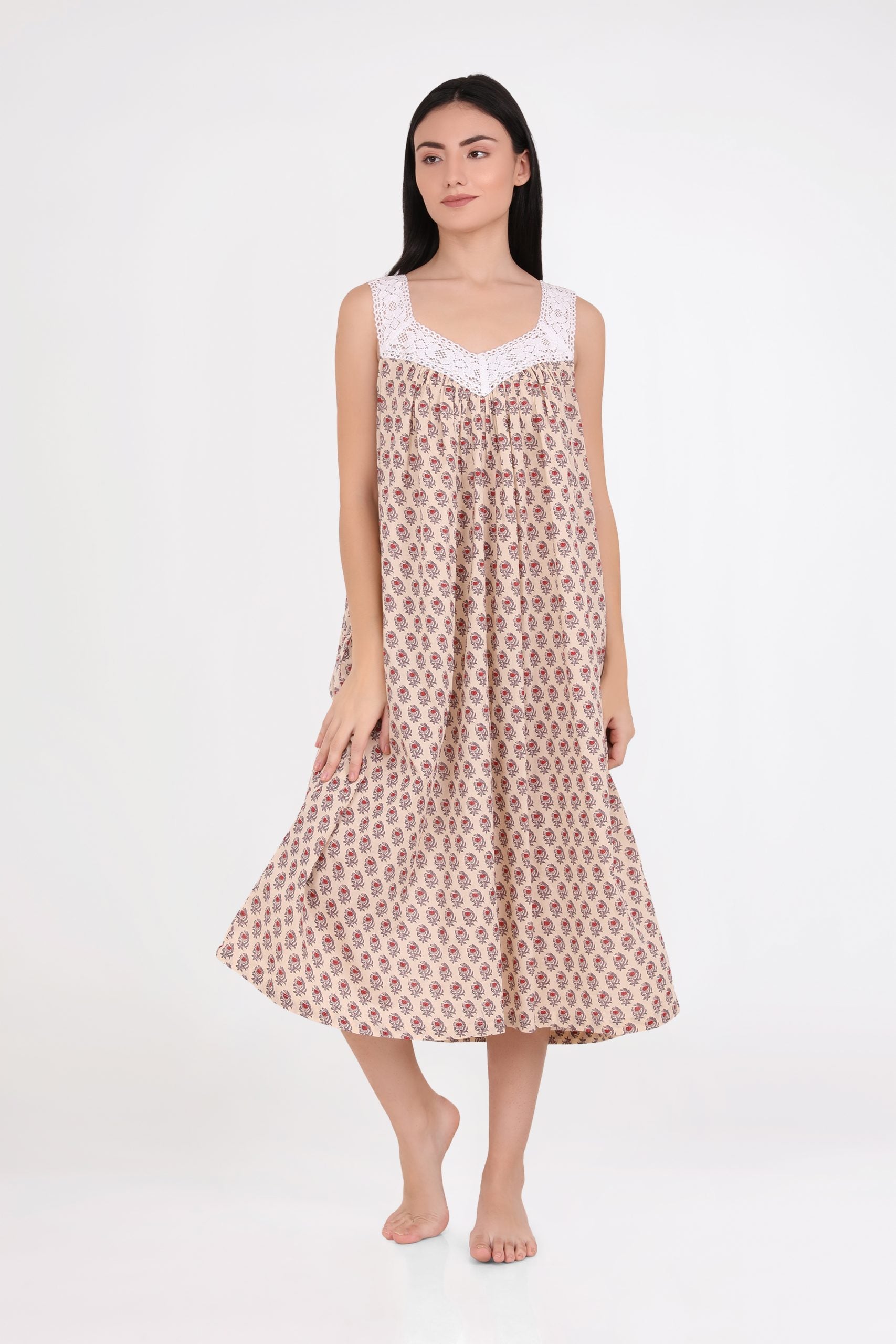 We just love these gorgeous cotton nighties. This one comes with a lovely red floral print on a cream background with a v-neck lace trim around the neckline.