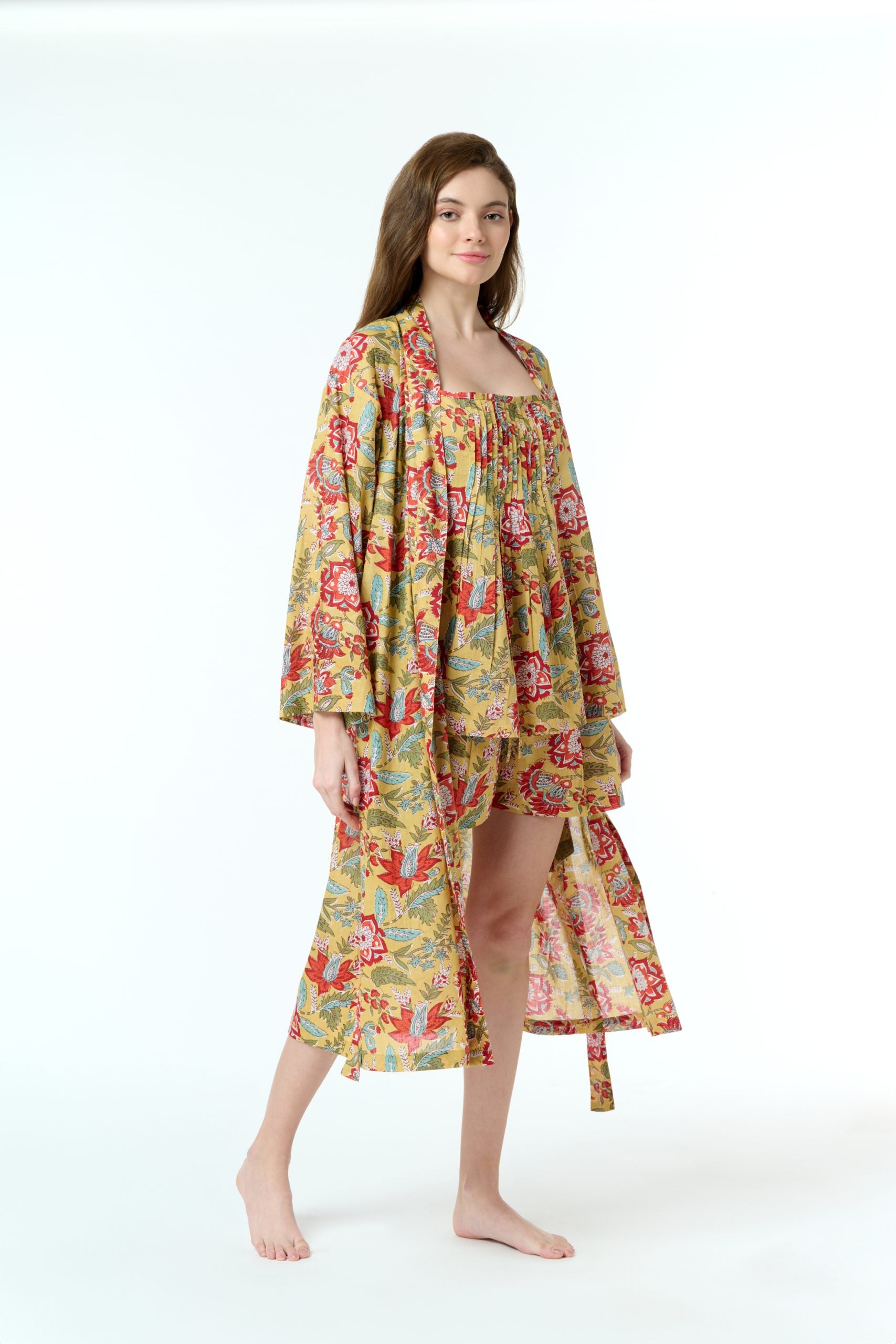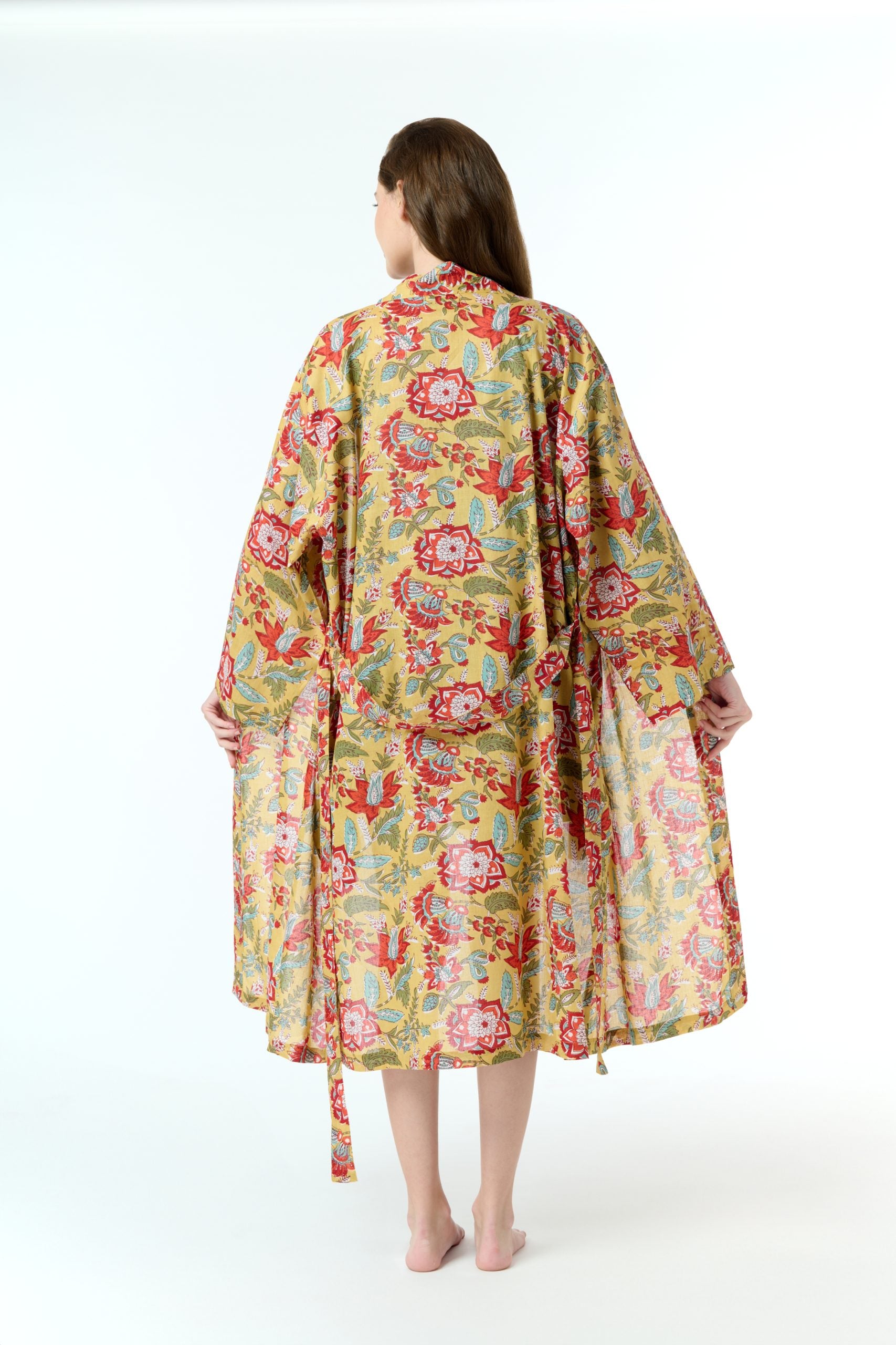 We just love these gorgeous cotton robes in a variety of prints. This one features a lovely combination of florals on a mustard background. In the softest cotton, they wash so well and feel great on.