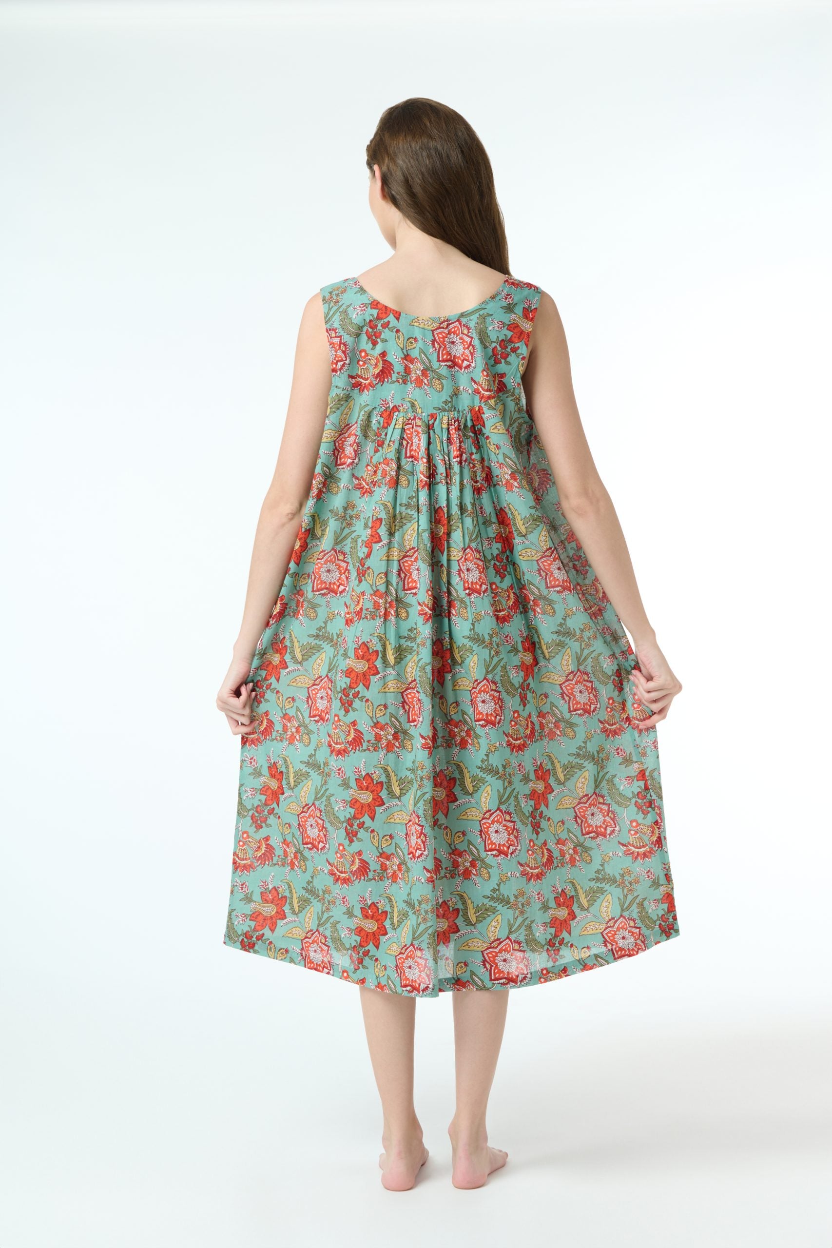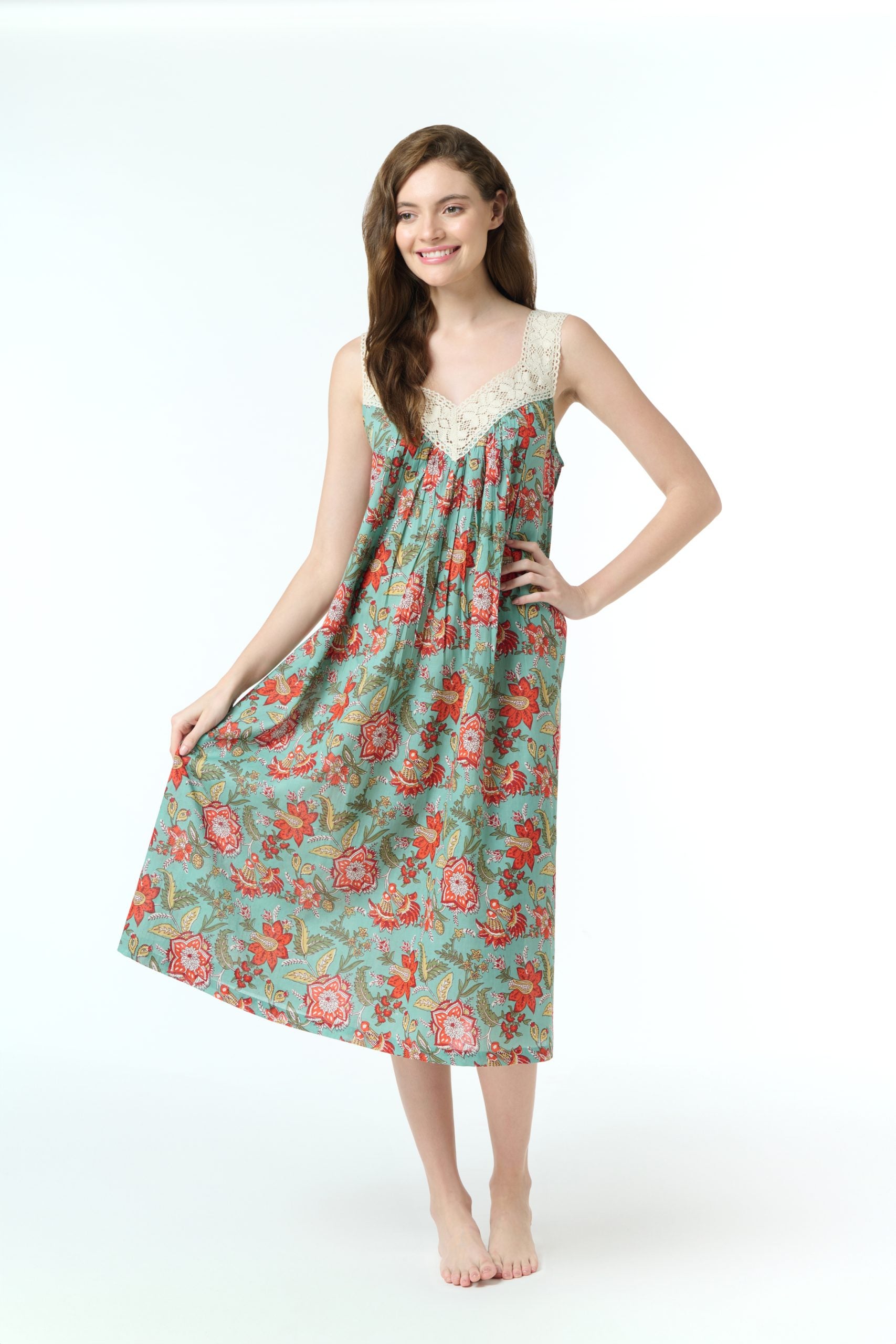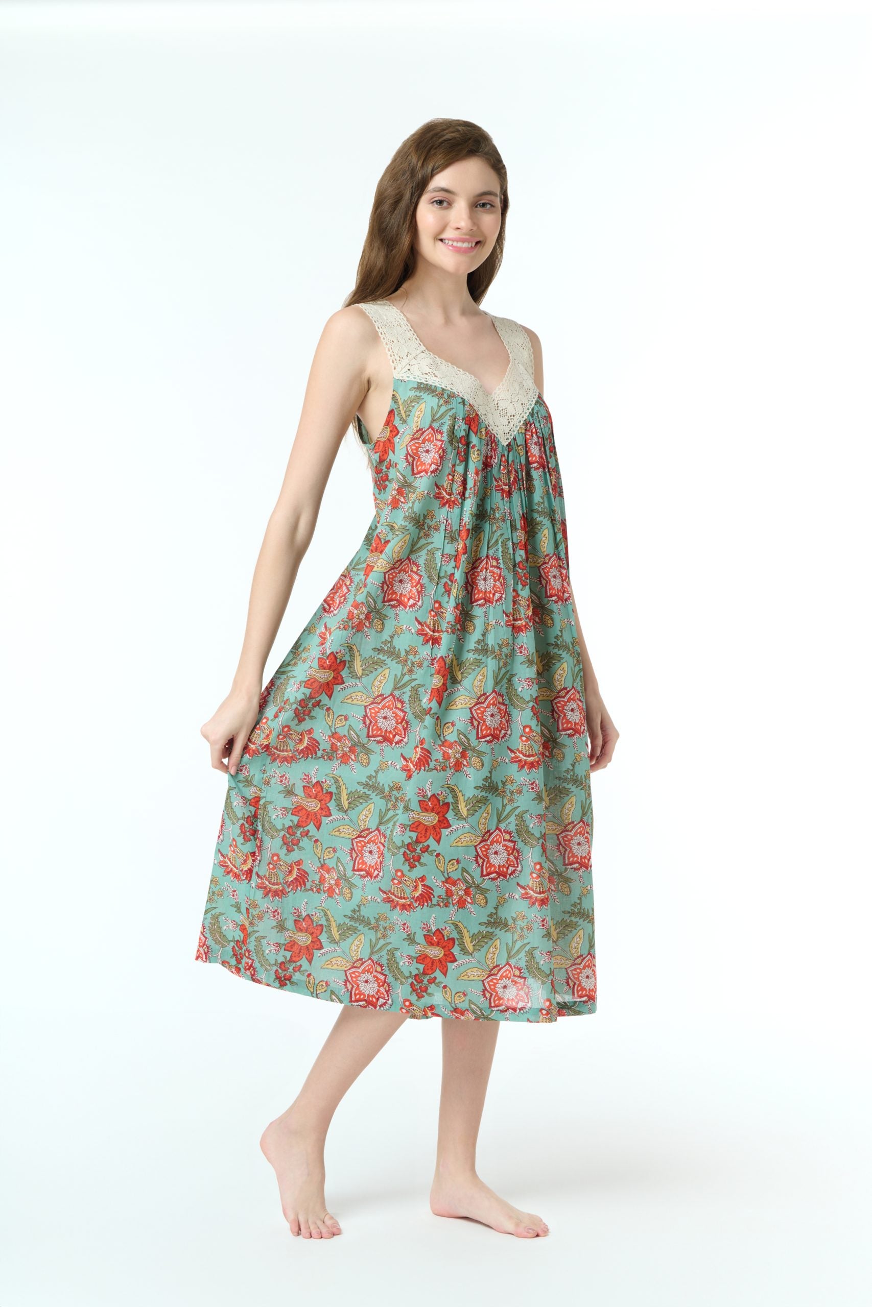 We just love these gorgeous cotton nighties. This one comes in a teal fabric with red florals print with a v-neck lace trim around the neckline.