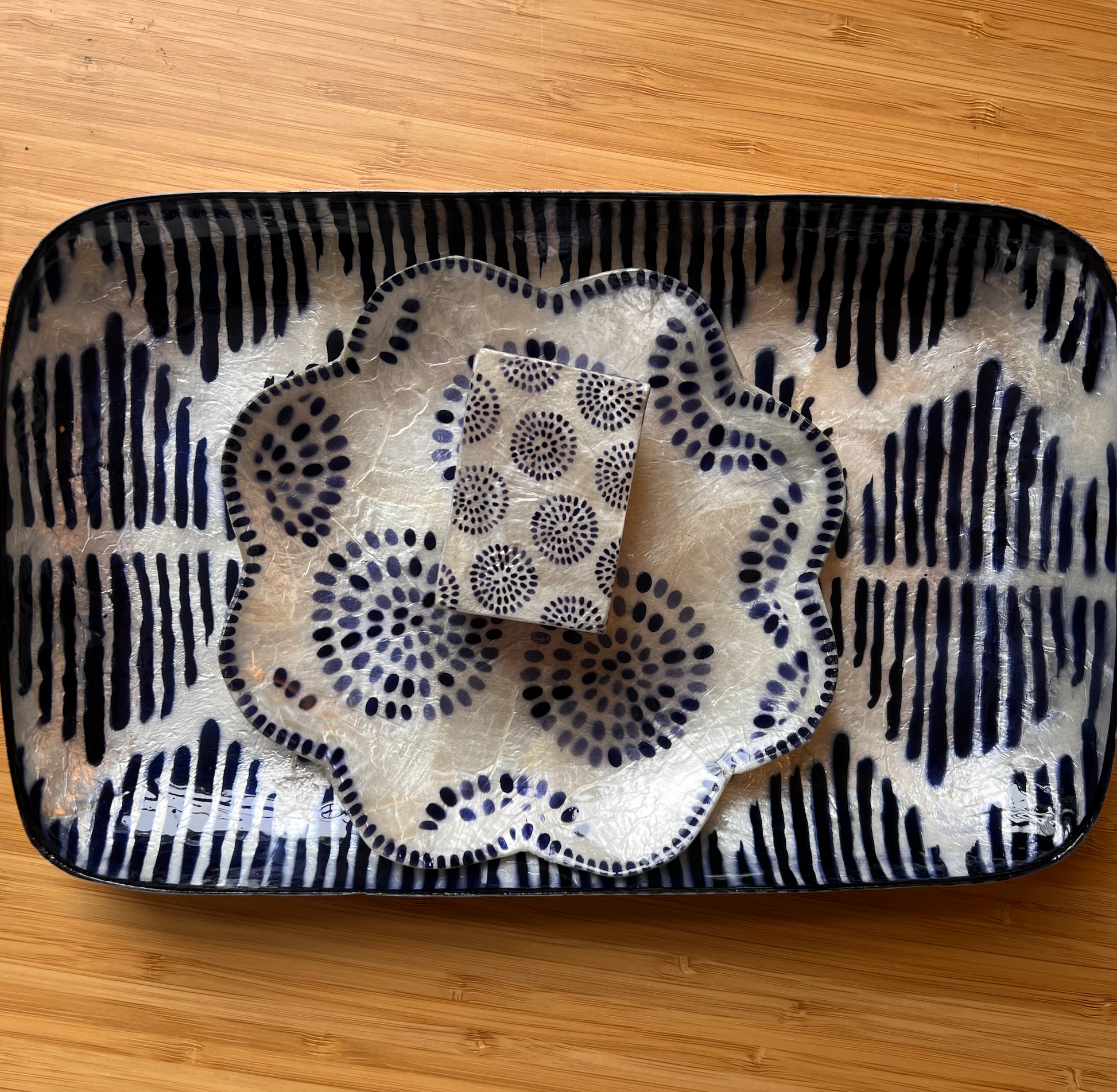 The Atlantic collection, where the soothing vibes of the deep blue ocean meet the timeless charm of ikat patterns, spots, and palm trees. Each piece is a canvas of coastal beauty, hand-drawn and hand-painted on natural capiz shell from the Philippines. From boxes to trays and dishes, these artisanal creations not only bring functional style but also infuse your space with the classic coastal vibes of blue and white decor.