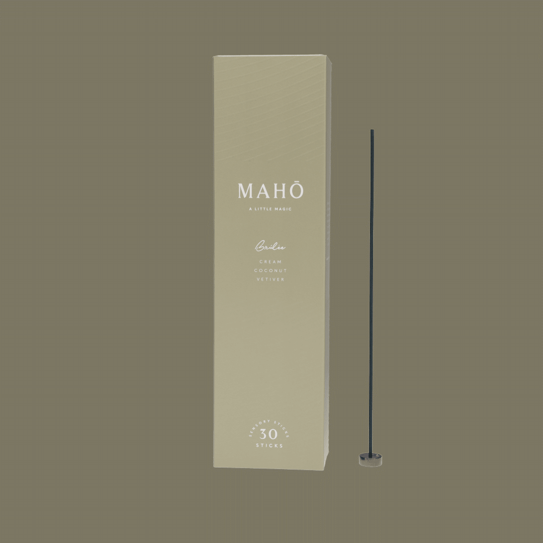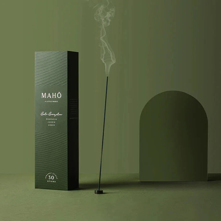 Light the tip of one incense over fire. Extinguish the flame by blowing or fanning. Incense should emit a glowing ember and fragrance with smoke. Return smouldering Sensory Stick to the MAHŌ Incense burner.