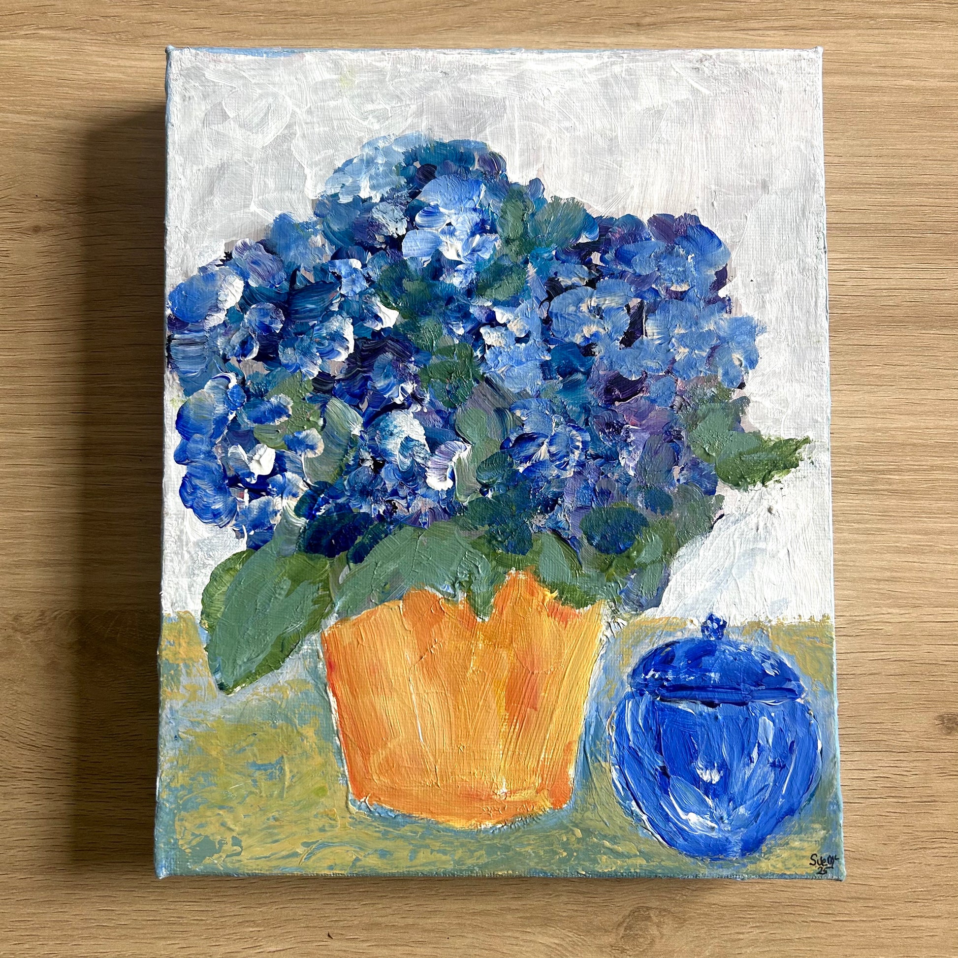 This 25cm x 20cm acrylic paint canvas features a gorgeous bunch of blue hydrangeas in a terracotta pot with a small blue jar in the foreground.
