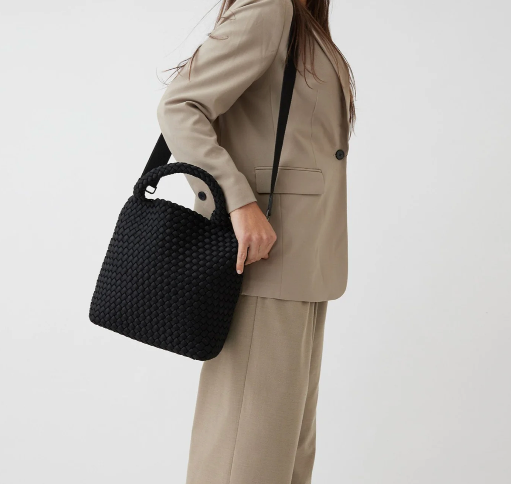 Wear it cross body, as a handbag or over the shoulder the choice is yours with its adjustable strap. Crafted from durable, water-resistant and machine washable premium neoprene, this bag is perfect for travel, work or the gym. Plus it includes a matching clutch that's ready to shine solo and a magnetic buckle for extra security.