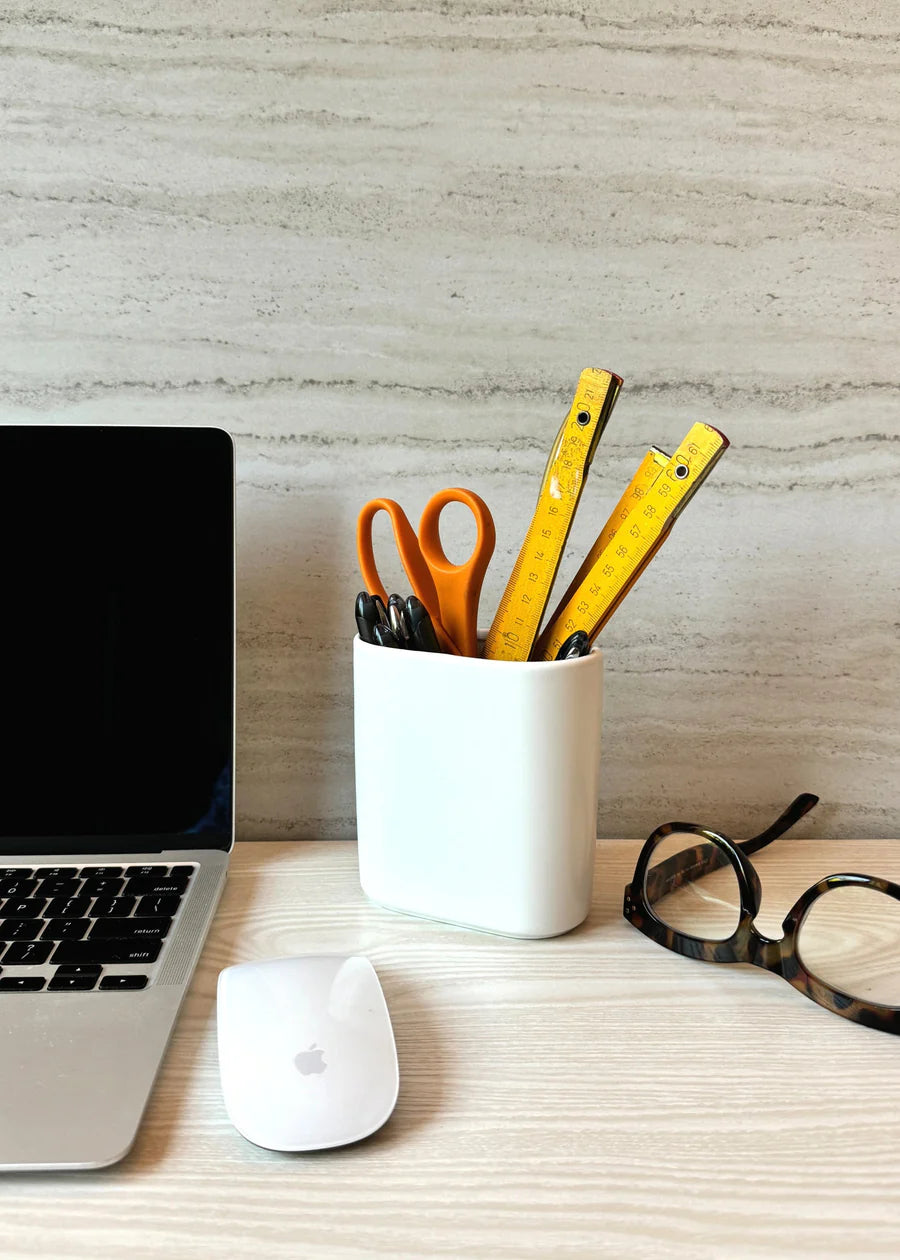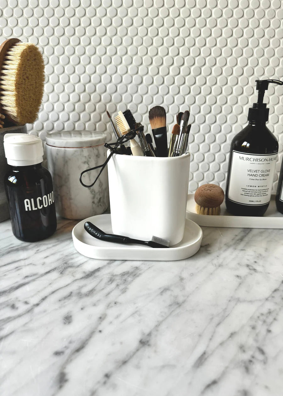 The eternal question for every smart sink-side setup...where to put the dish brushes and sponge? We solved that little domestic problem with a ceramic brush caddy with built-in drainage (so no mucky water pools at the bottom of the cup). Use it alone or pair it with one of our new Deco Trays. The elegant shape looks good from any angle. Perfect for people with kitchen islands that face out onto a living room.