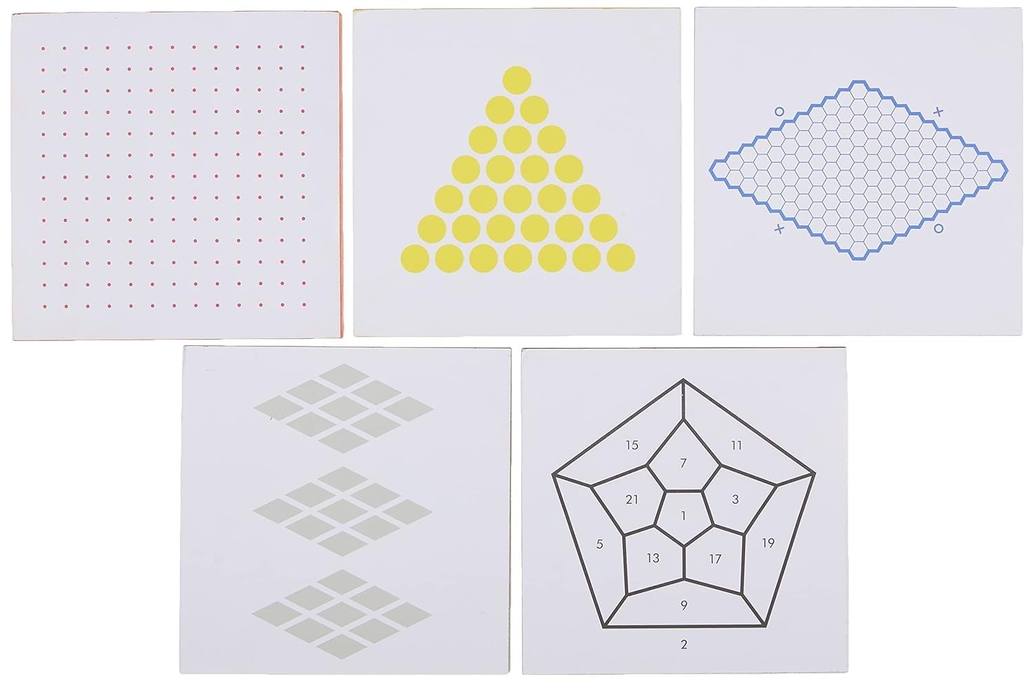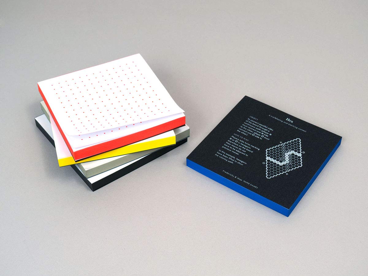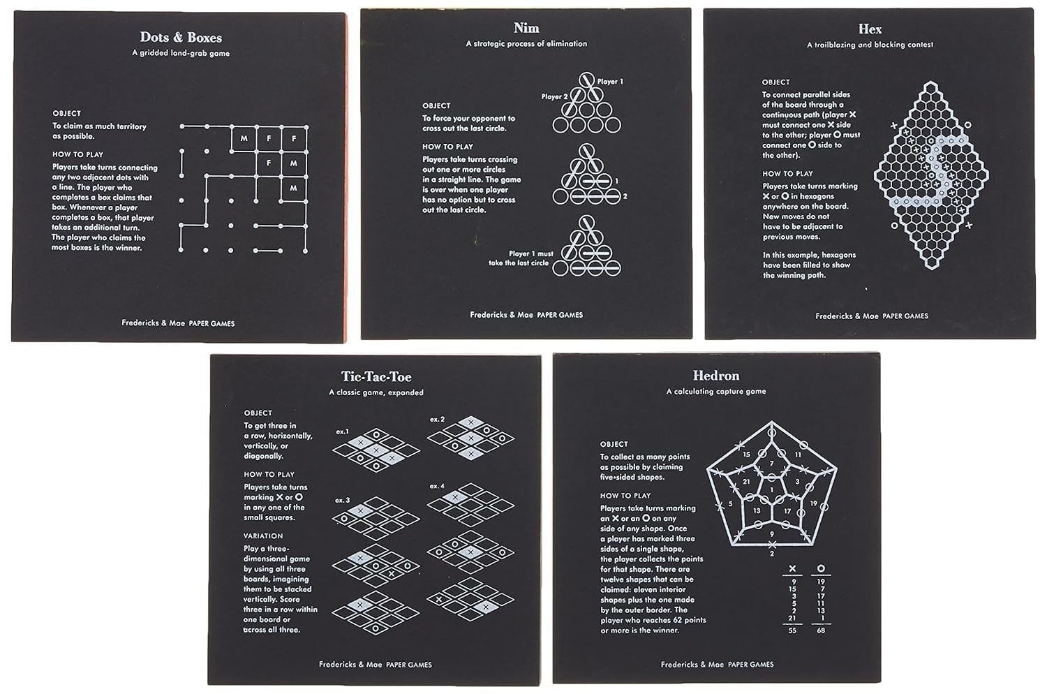 The set includes five two-player games, some familiar and some new: three-dimensional Tic-Tac-Toe, Dots & Boxes, Hedron, Nim, and Hex.