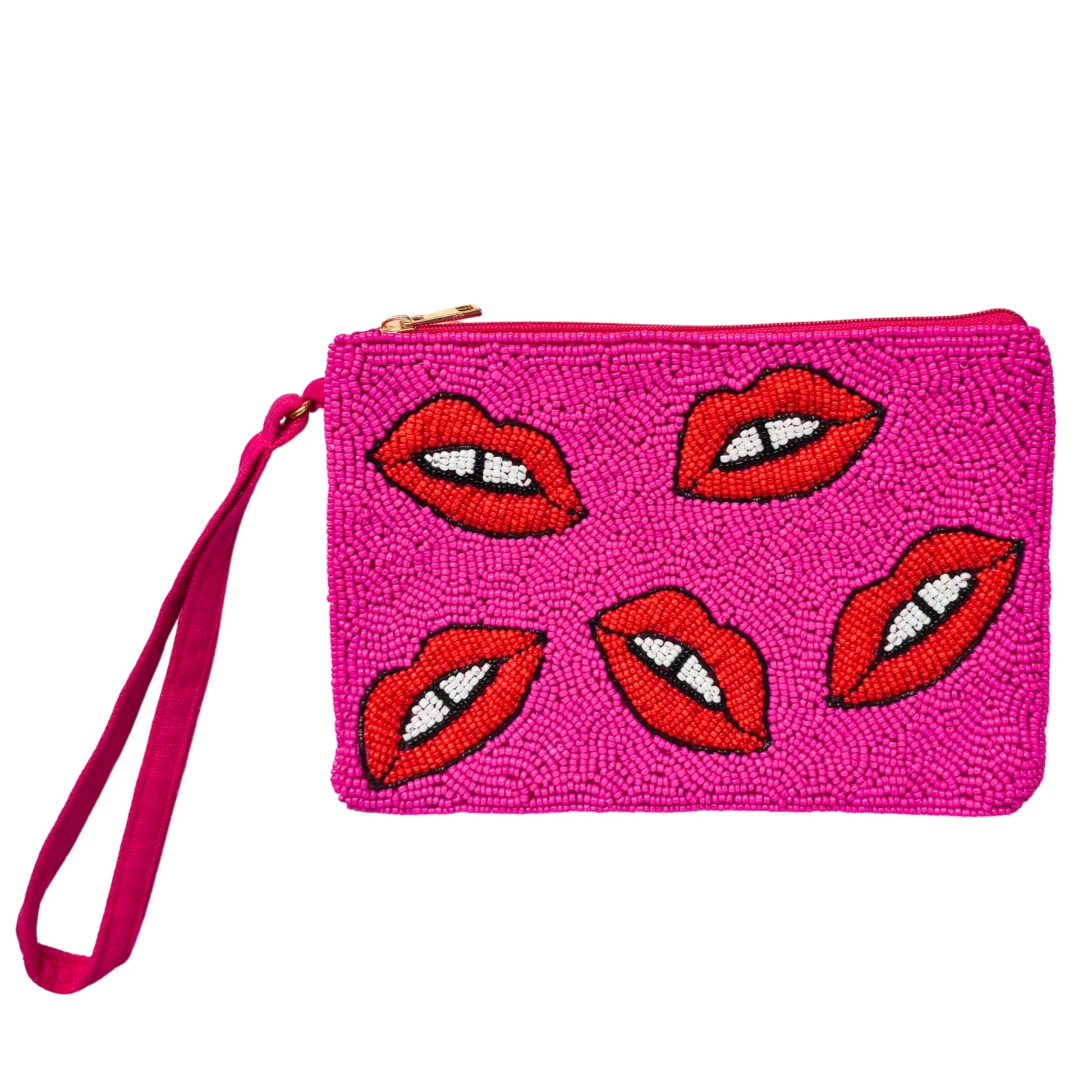 This vibrant pink beaded clutch is a true statement piece, featuring bold red lips hand-beaded onto a hot pink background. With a soft cotton back, secure top zip closure, and a convenient wrist strap, itโs the perfect way to add some playful attitude to your outfit.
