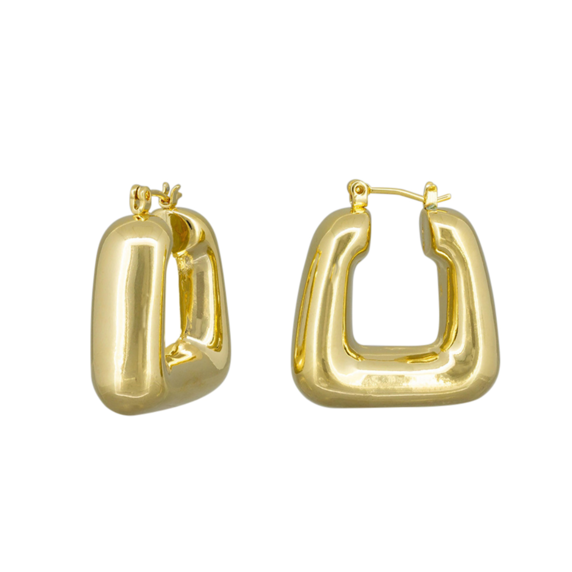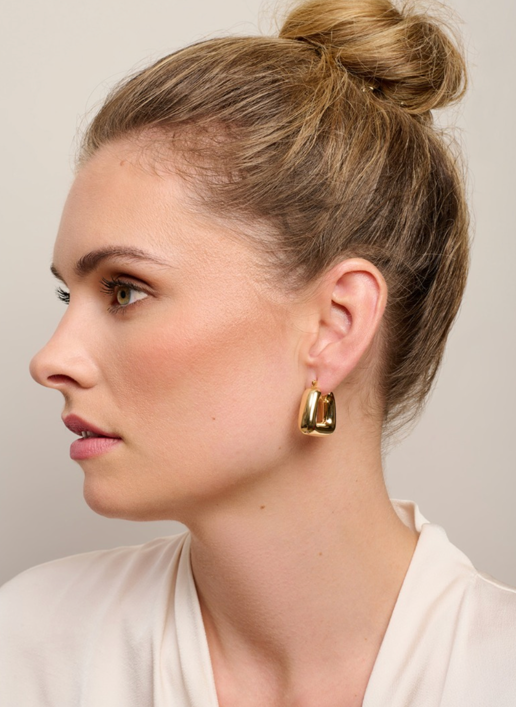 Make a statement with these bold, sculptural hoops. Crafted from recycled brass and plated in gold, they feature a modern, chunky silhouette with hypoallergenic posts for all-day comfort. Lightweight yet impactful, they’re the perfect finishing touch to any look.