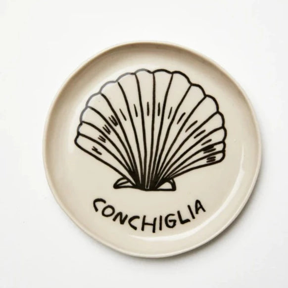 The delightful illustration of a seashell adorns this dish, as if whispering tales of ocean breezes and sandy beaches. Just below, the word "conchiglia" dances with Italian charm, creating the perfect vessel to use for snacks or trinkets.