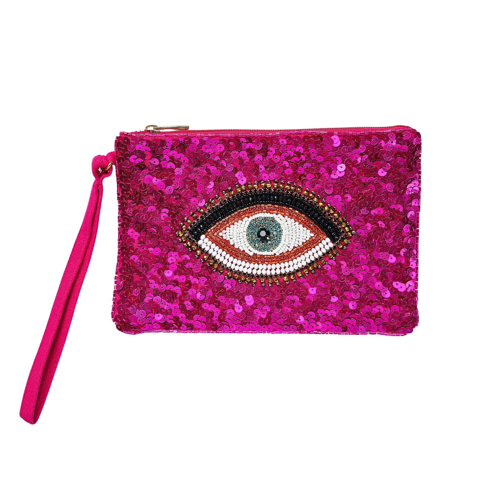 Bold, bright, and fabulous! We love these fabulous new arrivals for adding a pop of colour to your outfit. This dazzling pink beaded clutch is covered in shimmering sequins, with a striking beaded evil eye design at its centre.