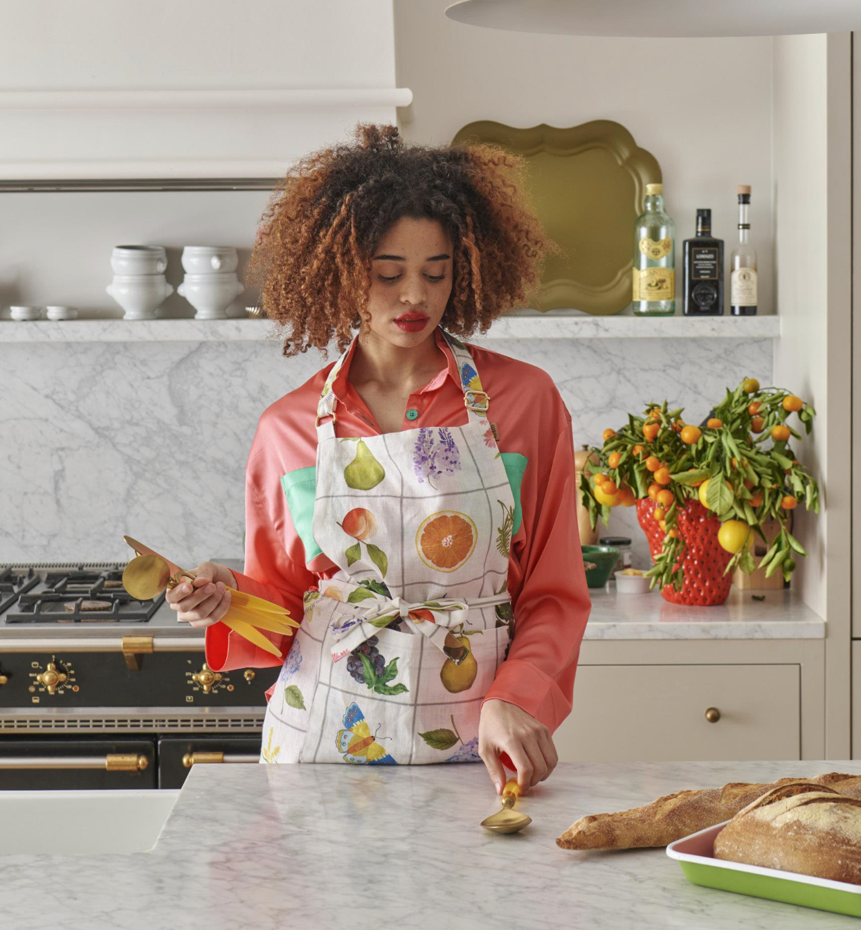 Made from 100% French flax linen, with handy front pouch pocket, this apron features an enchanting treasure trove of nature's bets bits, with a patchwork of white squares filled with a delightful menagerie of flowers, butterflies, beetles, fruit, and flora.