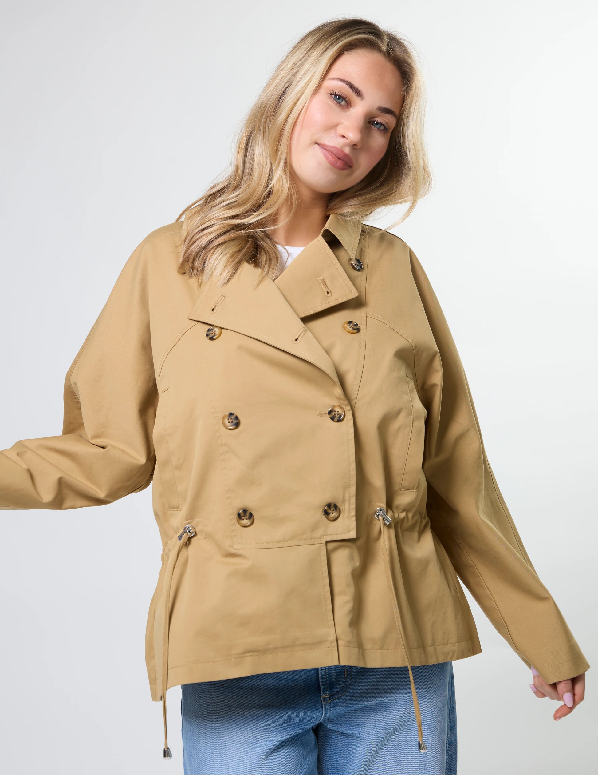 Introducing the Stella + Gemma Reece Jacket for new season Autumn winter 26. Lightweight double breasted jacket with collar, adjustable elasticated cord tie with toggle through waist and welt pocket detail.