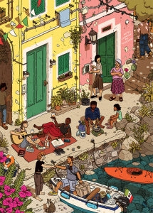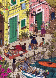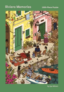 Riviera Memories: 1000-Piece Puzzle is a jigsaw puzzle illustrated by Ilya Milstein, an Australian artist living in New York. Set in a colourful and gently ageing seaside town, Riviera Memories depicts a range of travellers meaningfully interacting with their surroundings in the beautiful Italian Riviera: cooking, sketching, and enjoying conversation.