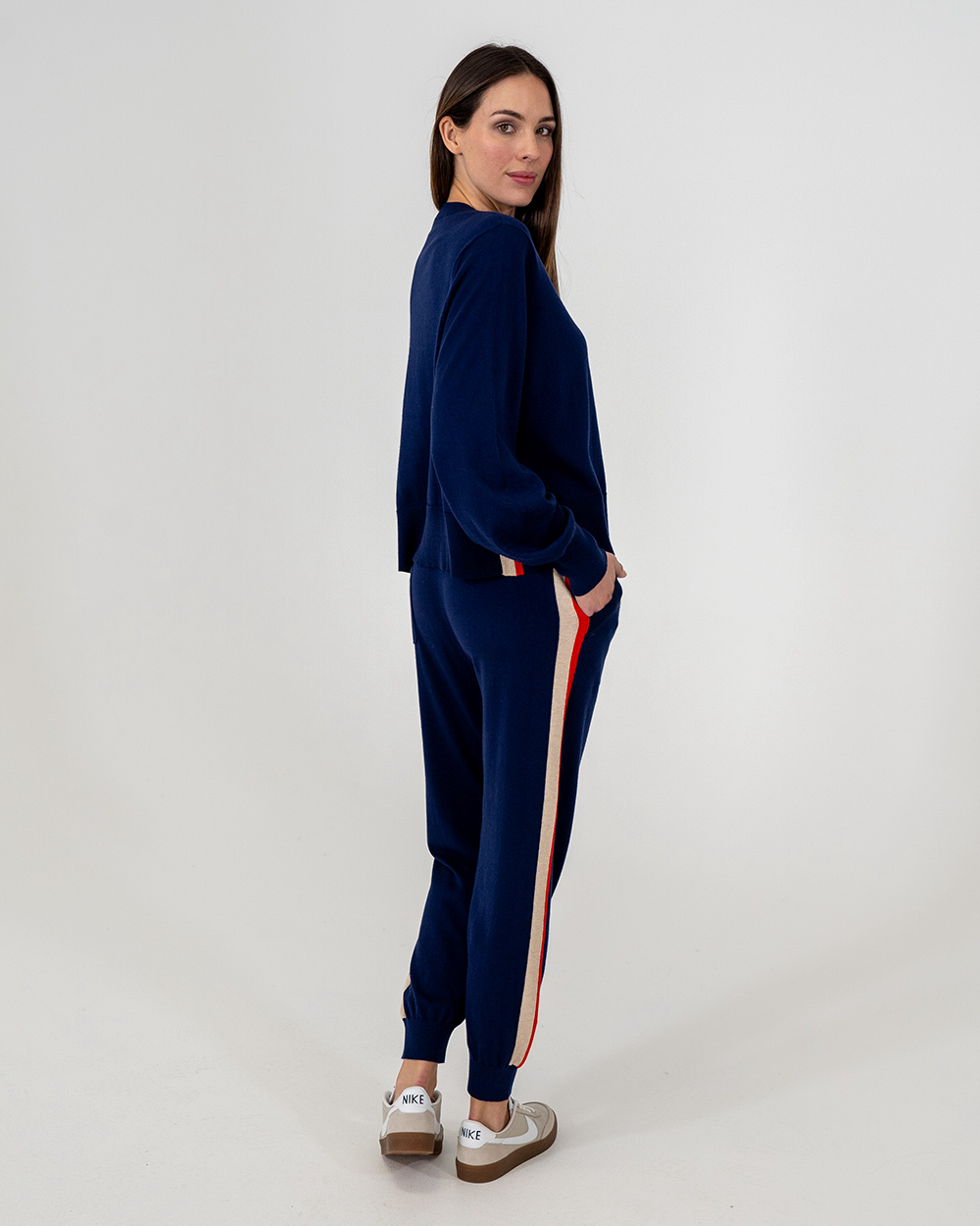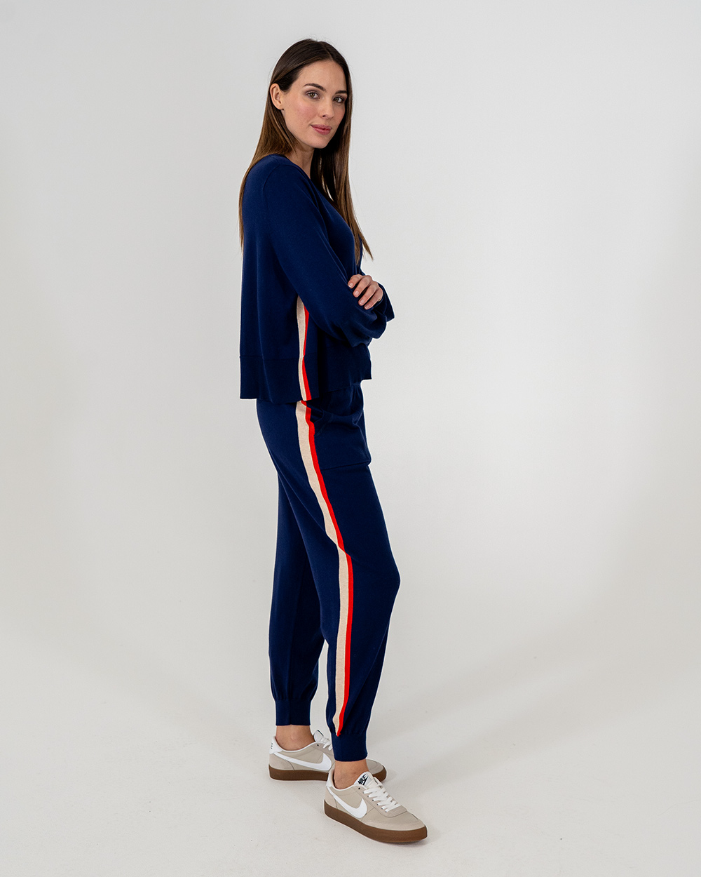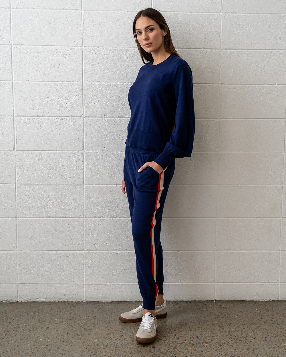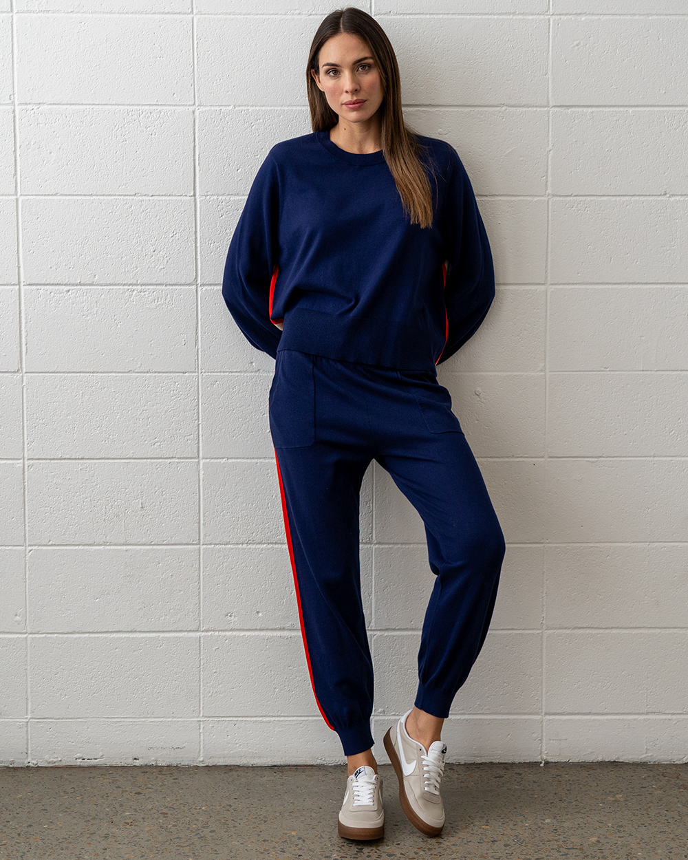 The Speed Stripe Track Pant by Arlington Milne. A jogger leg pant crafted from a luxurious cotton cashmere blend, they offer the perfect combination of softness and durability with a sporty twist featuring a contrast racer stripe down the side. Its elastic ribbed waist, completed with a knitted drawcord, ensures a customisable fit for all day wear. With ribbed welt pockets, this pant offers practicality without compromising on style. Whether you're lounging at home or running errands, these track pants are designed to keep you comfortable and chic throughout the day.