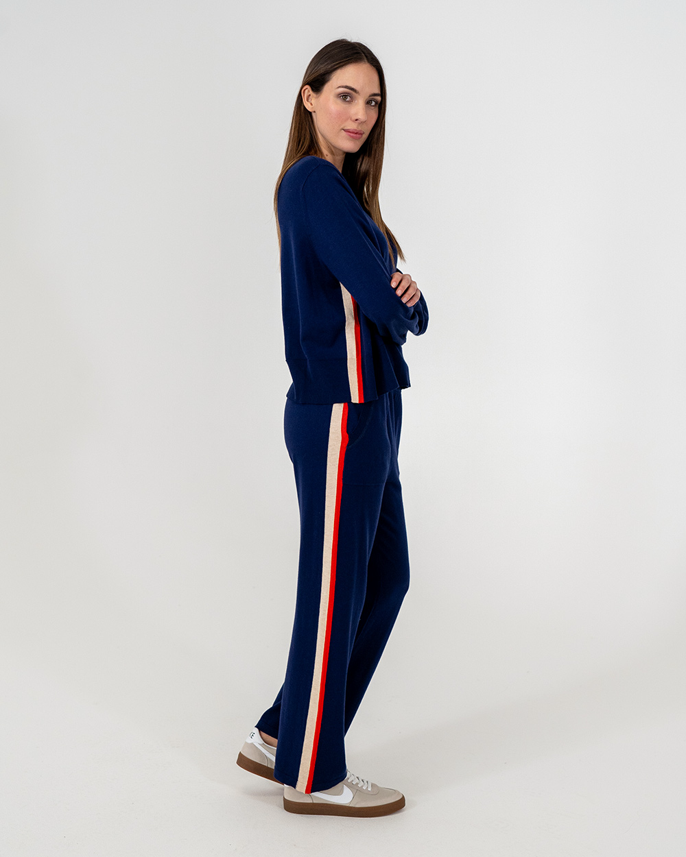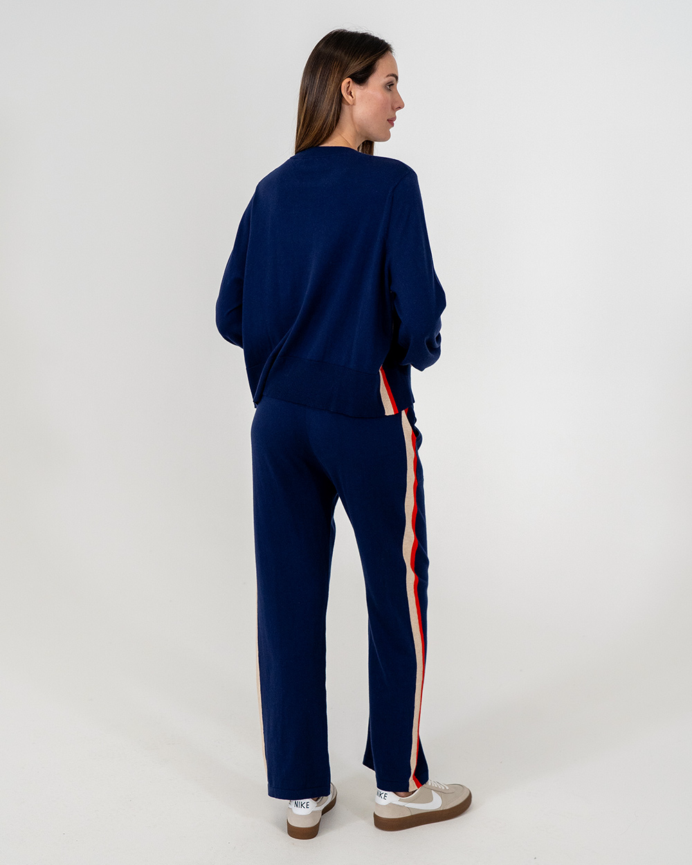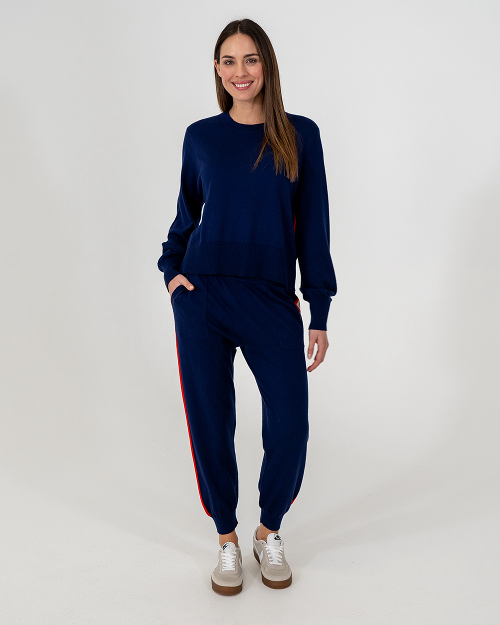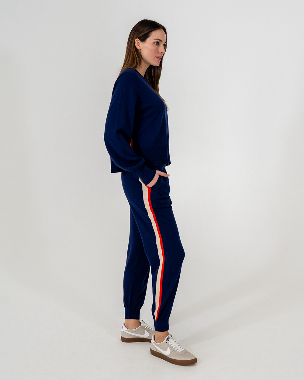 The Speed Stripe Track Pant by Arlington Milne. A jogger leg pant crafted from a luxurious cotton cashmere blend, they offer the perfect combination of softness and durability with a sporty twist featuring a contrast racer stripe down the side. Its elastic ribbed waist, completed with a knitted drawcord, ensures a customisable fit for all day wear. With ribbed welt pockets, this pant offers practicality without compromising on style. Whether you're lounging at home or running errands, these track pants are designed to keep you comfortable and chic throughout the day.