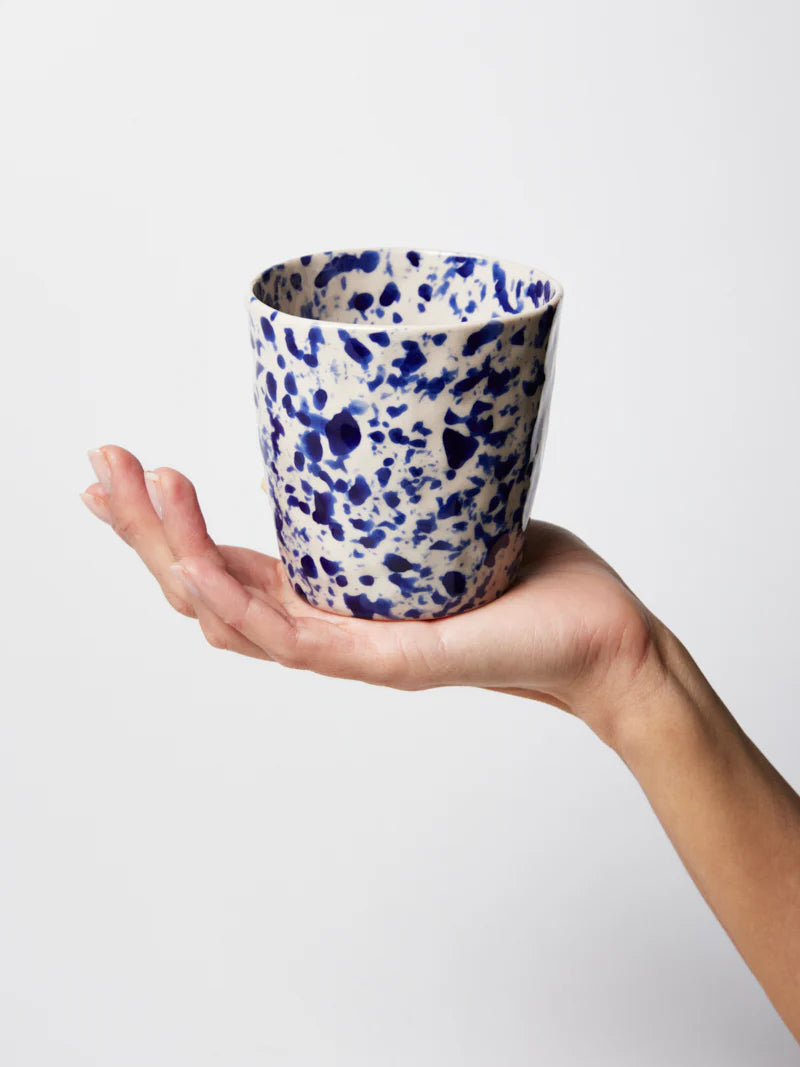 Sip from inspired Puglian splatterware artistry with the Splatter Tumbler in Blue. Each one-of-a-kind tumbler features spontaneous navy glazed splatters hand-painted over an unglazed stoneware body by skilled artisans. The stylish straight-sided cylindrical shape offers a modern silhouette for enjoying beverages infused with timeless Italian ceramic tradition and freeform brushwork design.