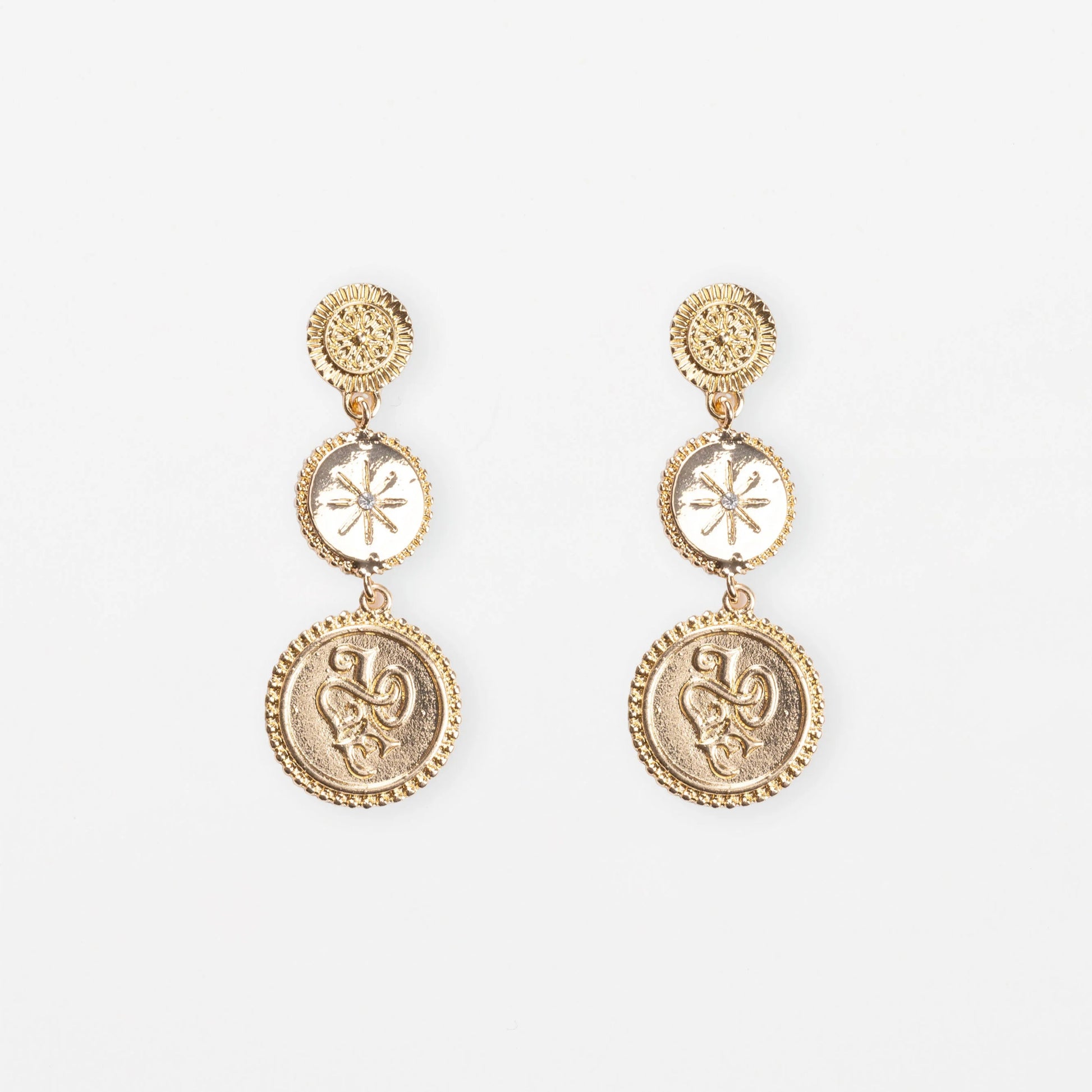 Add a touch of elegance and fun to your outfit with our Triple Medallion Gold Earrings. Each drop earring features three unique designs, making them a versatile and eye-catching accessory. Elevate your style with these must-have earrings.